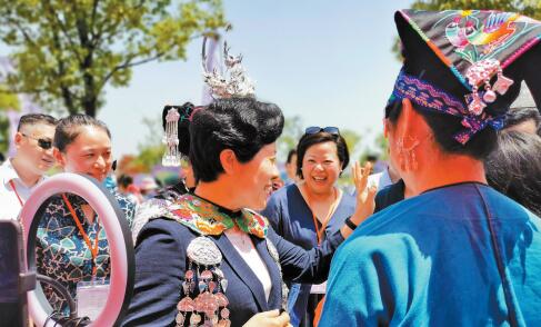 湖南省副省長吳桂英(中)體驗苗繡