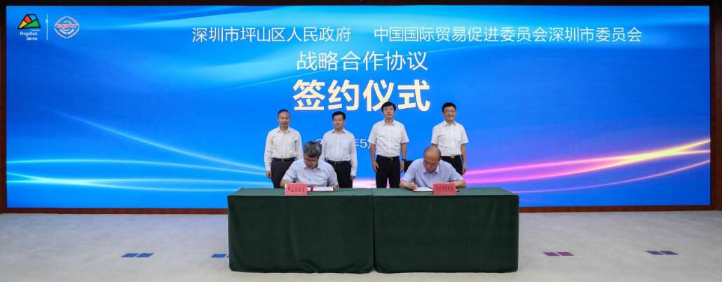 【香港商報訊】記者焦家志報道:為搶抓粵港澳大灣區和先行示範區建設重大戰略機遇,推動市貿促委國際化、專業化優勢和坪山生物產業基礎優勢融合對接,努力打造面向全球、面向未來的生物醫藥產業發展新高地,5月21日上午,深圳市坪山區人民政府與中國國際貿易促進委員會深圳市委員會(以下簡稱「市貿促委」)簽訂推動深圳生物醫藥產業發展戰略合作協議。深圳市副市長黃敏,坪山區委書記陶永欣、區長李勇,市貿促委主任顧東忠等出席簽約儀式,並就深化合作進行座談。