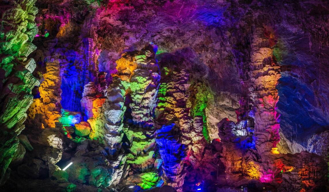 凌霄岩是喀斯特地貌,上、中、下三層,總高177米,廳外有山色田園,廳中有蜿蜒的小河,可以乘船穿堂而過,去往他鄉異地,仿如雲霧中的桃花源。