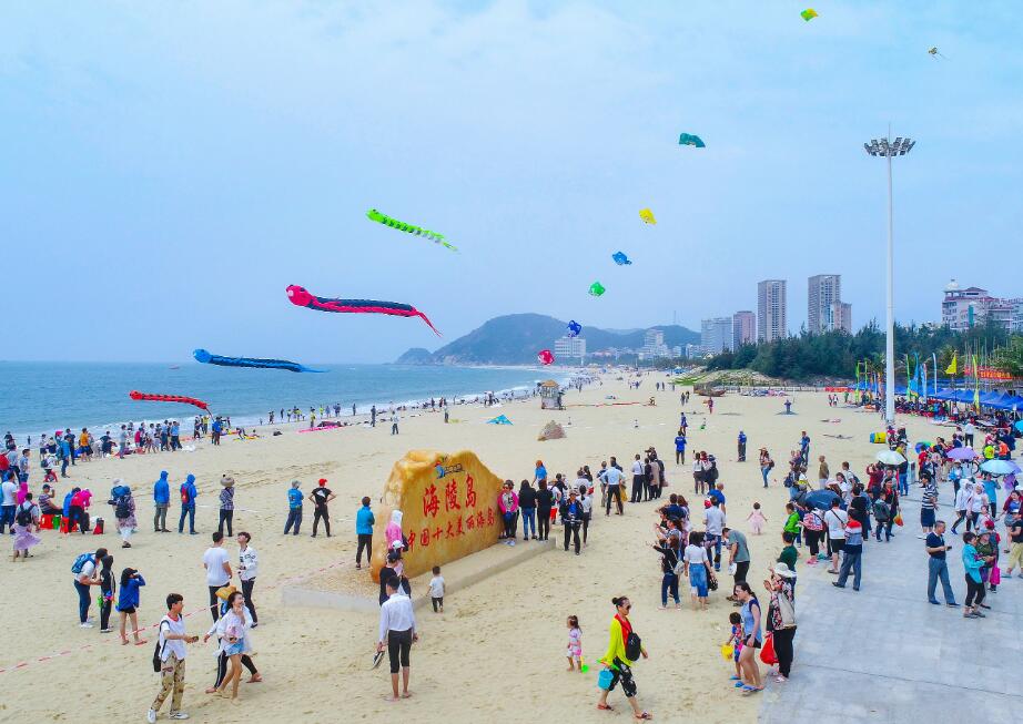 陽江第一大島海陵島,有着丘陵、平原、沙壩、灘塗地形,島南岸大角環沙壩呈灘狀長臥於海濱,沙灘長8000米,平均寬150米,有前灣後湖、六灣拱護、八峰環繞,這裏海水清澈,沙質細膩,風景宜人,適宜游泳和沖浪,被稱為十里銀灘,是中國最長最美的沙灘。