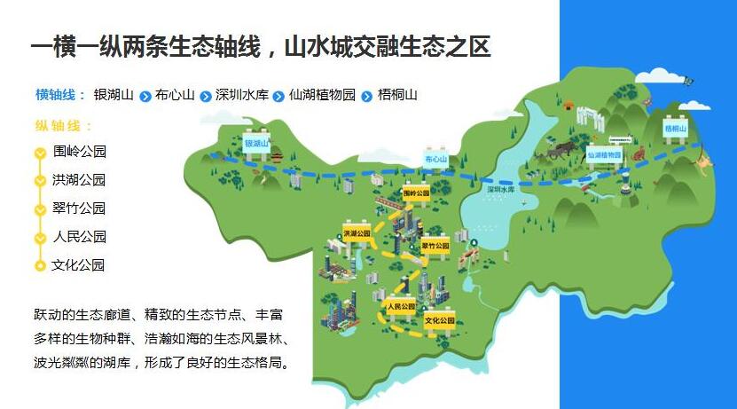 唐湘良在雙周發佈會指出,從橫軸線看羅湖,有銀湖山—布心山—深圳水庫—仙湖植物園—梧桐山;從縱軸線看羅湖,有圍嶺公園—洪湖公園—翠竹公園—人民公園—文化公園。躍動的生態廊道、精緻的生態節點、豐富多樣的生物種群、浩瀚如海的生態風景林、波光粼粼的湖庫,形成了良好的生態格局。