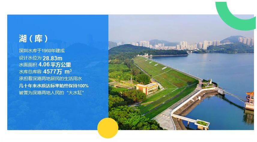 深圳水庫於1960年建成,設計水位為28.83m,水面面積4.06平方公里,水庫總庫容4577萬立方米,幾十年來水質達標率始終保持100%,持續為深港人民提供優質飲用水,被譽為深港兩地人民的「大水缸」。