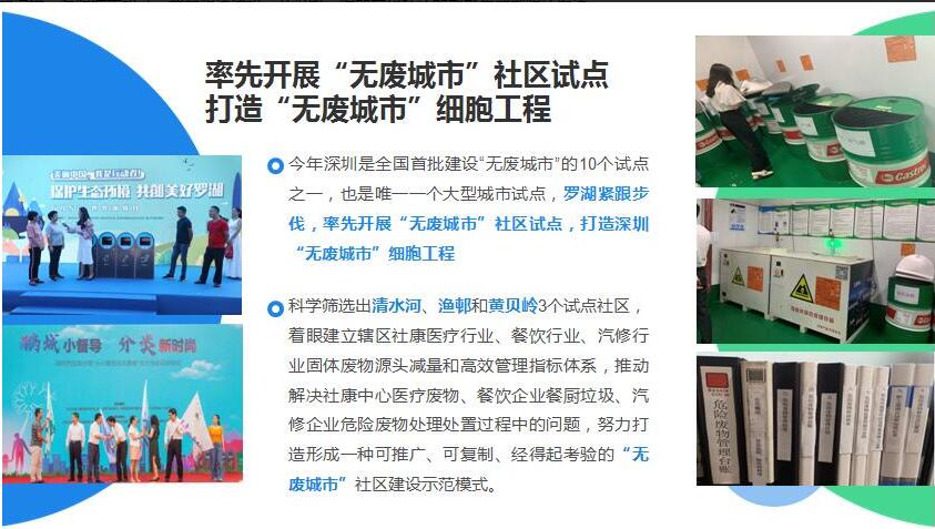目前羅湖已科學篩選出清水河、漁邨和黃貝嶺3個試點社區,將着眼建立轄區社康醫療行業、餐飲行業、汽修行業固體廢物源頭減量和高效管理指標體系,推動解決社康中心醫療廢物、餐飲企業餐廚垃圾、汽修企業危險廢物處理處置過程中的問題,努力打造形成一種可推廣、可複製、經得起考驗的「無廢城市」社區建設示範模式。