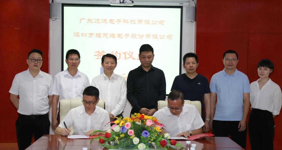 廣東達進電子科技有限公司與深圳超思維電子股份有限公司舉行簽約。後排簽約見證人有:廣東達進電子科技有限公司執行董事、行政總裁許明(左4);深圳市超思維電子股份有限公司董事長張家斌(左3);深圳市超思維電子股份有限公司總經理張家武(左5);廣東達進電子科技有限公司執行董事郭俊豪(左6);廣東達進電子科技有限公司財務總經理陳昌智(左2);廣東達進電子科技有限公司財務經理范小燕(右1);達進超思維董事肖宗國(左1); 前排簽約代表為:廣東達進電子科技有限公司執行董事曾擁光(右);深圳市超思維電子股份有限公司副總經理文藝(左)