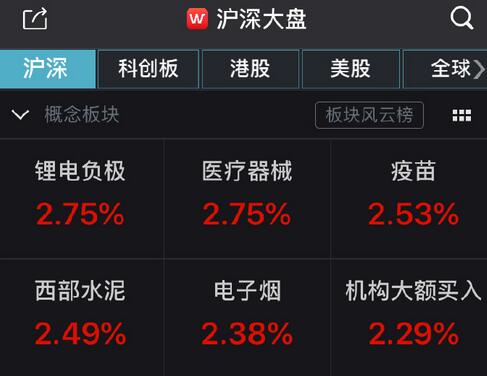 盘面上看,医疗器械、医药、水泥、动力电池、零售板块涨幅居前,光刻胶、航空、餐饮旅游、保险板块跌幅居前。