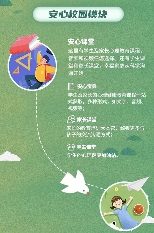 「校園安心行動」線上服務平台突出以下幾個特點:一是資源豐富,彙集市安心行動、區教育、衛生、群團等心理服務資源,實現宣教、諮詢、干預、診療一站式便民服務;二是建立「四位一體」幫扶網絡,通過安心校園、安心家園、安心社區的多維架構,搭建涵蓋家庭、學校、社區、社會組織等在內的幫扶網絡,提升全社會共同關注青少年心理健康的意識;三是實現「碼上服務」,平台實時更新心理相關資訊,用戶還可跳轉至區黨群服務中心、區教育局、區衛生健康局、區婦聯的微信公眾號,獲取更多內容與服務,方便快捷,流程更優化;四是增加「交互功能」,在「我的」板塊,用戶可在平時的閱讀瀏覽中收藏自己感興趣的內容及距離較近的心理諮詢點或診療點,方便用戶高效查找所需內容,提升用戶使用體驗。