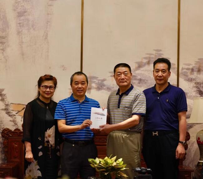 中國作家協會副主席徐貴祥(右二)代表採風團向江門市委宣傳部常務副部長漆建偉(左二)贈送由8位採風作家簽名的《品鑒嶺南》(2020)