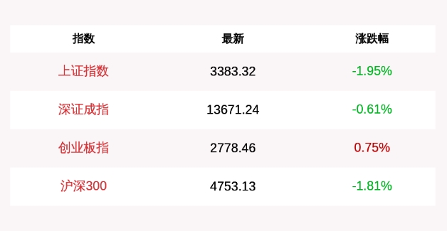 【香港商报网讯】今日两市低开,早盘沪指维持低位震荡,创业板指较为活跃,盘中冲高回落后再度上攻。午后,沪指跌幅扩大,创业板指涨幅收窄。截至收盘,沪指跌1.95%,报收3383点;深成指跌0.61%,报收13671点;创业板指涨0.75%,报收2778点。沪深两市成交额连续第五个交易日突破1.5万亿元。