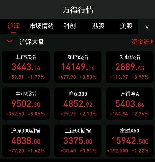【香港商报网讯】A股三大指数今日集体走强,其中沪指收盘上涨1.77%,收报3443.29点;深成指上涨3.50%,收报14149.14点;创业板指上涨3.99%,收报2889.43点。两市成交额连续6天突破1.5万亿,今日达到1.67万亿。行业板块全线上扬,农业板块掀起涨停潮。北向资金今日净流入96.57亿元。