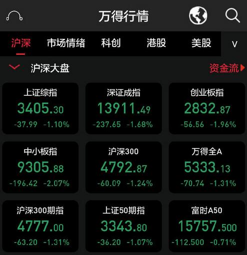 【香港商报网讯】A股三大指数宽幅震荡,船舶制造板块领涨,航天航空、园林工程、影视等概念表现强势,退税商店、光刻胶、转基因等概念领跌,截至发稿,沪指下跌1.10%,报3405.30点;深成指下跌1.68%,报13911.49点;创业板指下跌1.96%,报2832.87点。两市成交金额连续第9个交易日突破万亿,北向资金净流出超110亿。