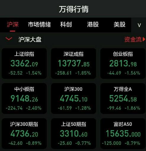 【香港商报网讯】A股三大指数今日展开宽幅震荡,最终集体收跌,其中沪指下跌1.56%,失守3400点整数关口,收报3361.30点;深成指下跌1.87%,收报13734.13点;创业板指下跌1.60%,收报2813.06点。两市成交额连续8天突破1.5万亿,今日达到1.57万亿。行业板块呈现普跌态势,旅游酒店板块逆市掀涨停潮。北向资金今日小幅净流出4.55亿元。券商板块跳水,半导体继续走弱,个股依旧跌多涨少,市场做空情绪释放,赚钱效应很差。
