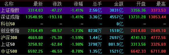 【香港商报网讯】周四(7月16日),A股三大指数下跌,沪指盘中失守3300点,保险和环保板块领涨。医废处理、园林工程、船舶制造等板块表现强势,白酒、长寿药、中芯概念、旅游酒店、生物疫苗等板块大跌。截至发稿,沪指下跌1.41%,报3314.03点;深成指下跌1.41%,报13540.95点;创业板指下跌1.73%,报2764.49点。