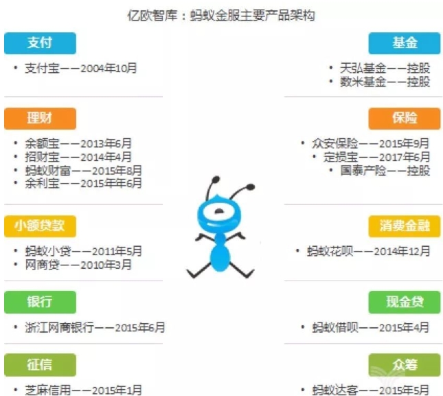 蚂蚁集团即蚂蚁金服,起步于2004年成立的支付宝,2014年10月,蚂蚁集团正式成立。当前,蚂蚁集团旗下有支付宝、余额宝、招财宝、蚂蚁聚宝、网商银行、蚂蚁花呗、芝麻信用等子业务板块。