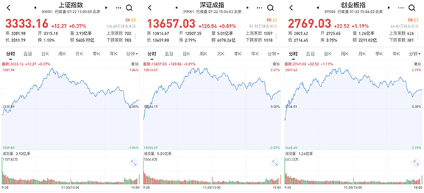 【香港商報網訊】7月22日消息,內地三大股指衝高回落,臨近尾盤小幅跳水,滬深兩市個股漲跌互半,炸板率近40%,市場情緒有所趨冷。螞蟻金服概念大幅分化,軍工、券商、免稅、半導體等板塊衝高回落,醫藥醫療板塊延續強勢,農業板塊逆市拉升,個股上,王府井、中國中免、瀋陽化工等午後回落,新題材的金達威、保齡寶表現強勢,整體上,題材炒作回暖,但輪動較快,且持續性不足,市場短線情緒表現一般。盤面上,油氣設服、農業種植、免稅等板塊漲幅居前,造紙、HIT電池、鋼鐵等板塊跌幅居前。截至收盤,滬指漲0.37%,報收3333點;深成指漲0.89%,報收13657點;創業板指漲1.19%,報收2769點。