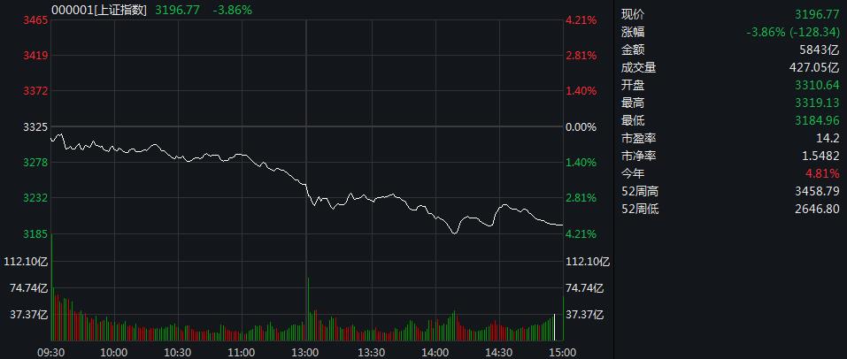 【香港商报网讯】7月23日,市场避险情绪升温,A股三大股今日集体走低,创业板指跌逾6%,沪指跌近4%,两市个股普跌。截至收盘,沪指跌3.86%,报3196.77点;创业板指跌6.14%,报2627.84点;深成指跌5.31%,报12935.70点。今日,沪深两市成交额突破1万亿元,已连续十七个交易日突破万亿元,北向资金净卖出超160亿元,其中沪股通净流出92.99亿元,深股通净流出70.58亿元。