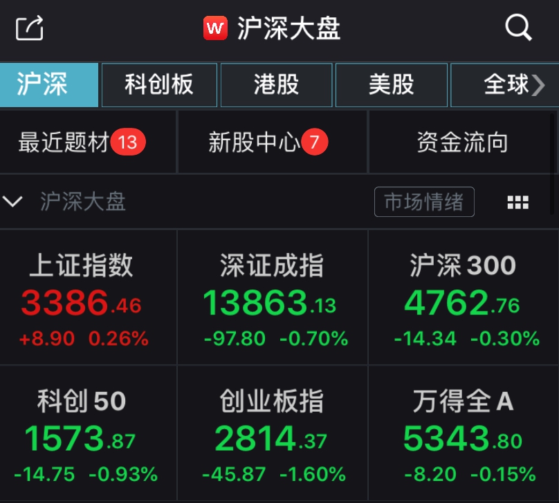 截至收盘,沪指报3386.46点,涨幅0.26%,成交额5704.88亿元;深成指报13863.13点,跌幅0.7%,成交额7132.42亿元;创业板指报2814.37点,跌幅1.6%。