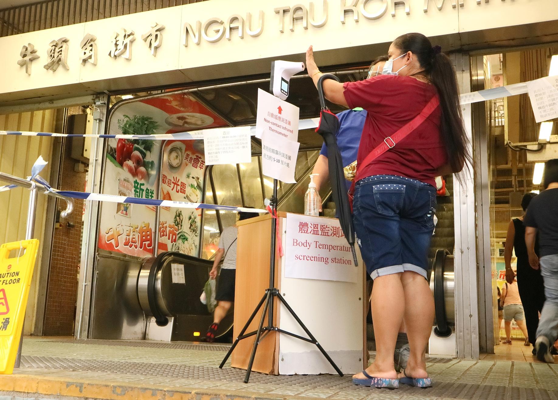 疫情下街市是高風險地方,因此政府在街市門口設有量體溫儀器,市民進入街市必須量體溫,這樣大家就可放心買菜。(冯翰文、蔡启文摄)