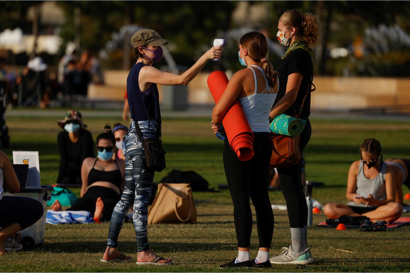 冠状病毒(COVID-19)爆发期间,美国加州圣迭戈的人们采取各种方式来度过疫情中的日子,当地时间8月24日,在位于市中心公园的户外瑜伽课堂,学员进入前先测体温;一名男子戴着口罩沿着河边散步;一位妇女携爱犬在草地上闭目养神;一位慢跑者沿着河边跑步时的影像反射在建筑物的玻璃窗上;一架联邦快递的货运飞机即将着陆。 (图源:路透社)