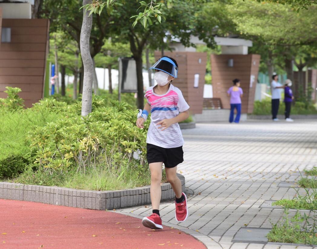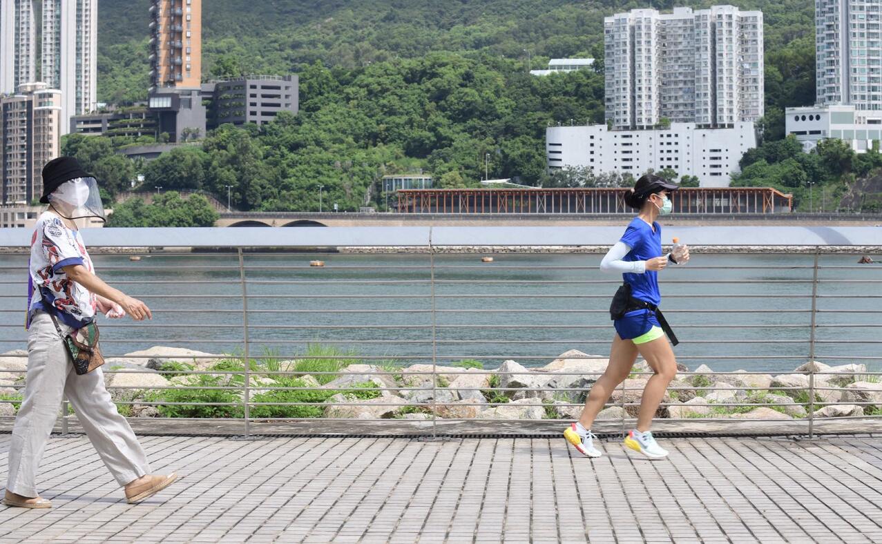 在持續疫情下, 市民繼續帶口罩跑步做運動以保健康, 期待著本周五政府放寬戶外運動的「口罩令」。(崔俊良攝)
