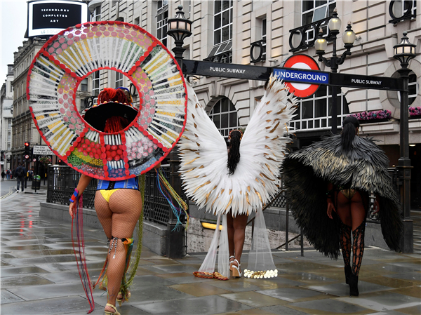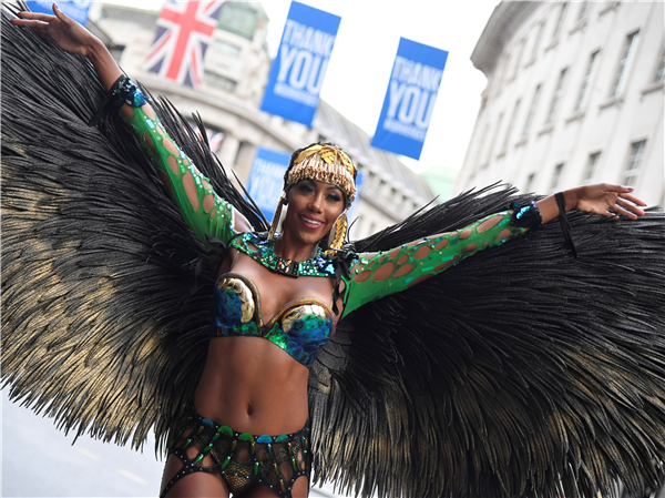 8月28日,一群舞者在伦敦街头宣传即将到来的第一个网上诺丁山狂欢节。由于受疫情的影响,主办方宣布取消今年的狂欢节活动,并改为在网上举行。诺丁山狂欢节起源于1964年,是欧洲规模最大的街头文化艺术节,每年8月底的最后一个周末在伦敦西区诺丁山地区举行,以非洲和加勒比地区文化为主题,是英国多元文化的象征之一。(图源:路透社)