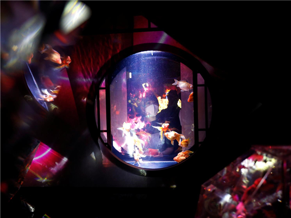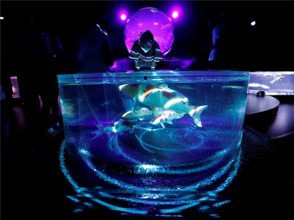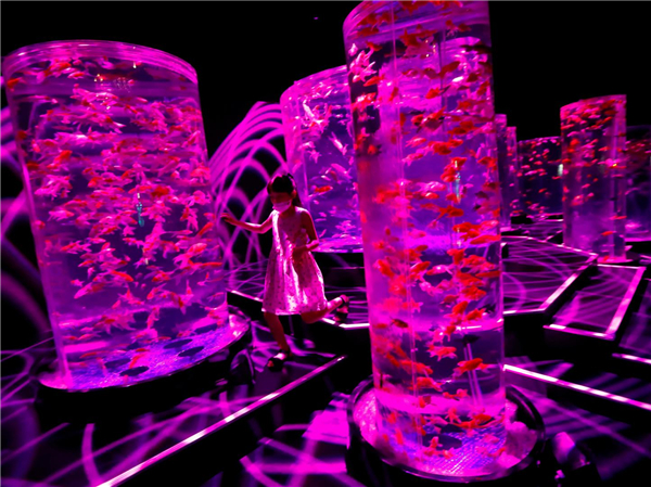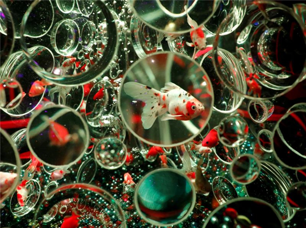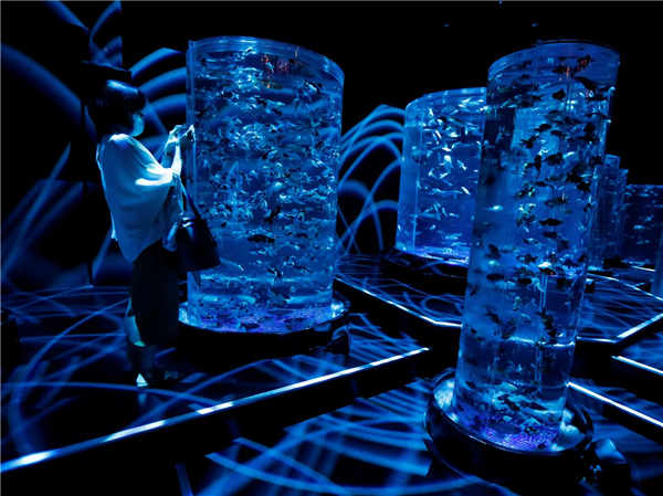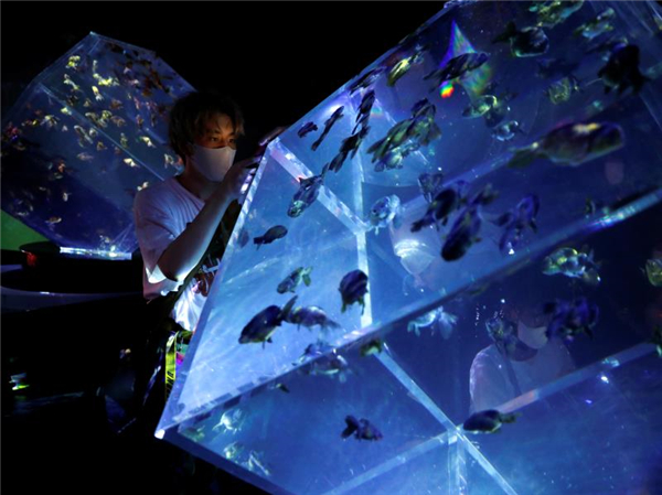 2020年8月28日,日本东京,由日本艺术水族馆艺术家木村喜久(Hidetomo Kimura)制作的艺术水族馆2020展,吸引了观众驻足观赏拍照。在梦幻般彩灯的映照下,各种造型的水箱中里鱼儿畅游,美轮美奂。(图源:路透社)