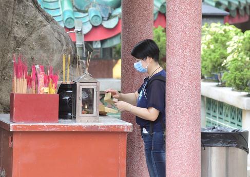 本港疫情改善,但限聚令未除,重開多時寺廟未見往日香火鼎盛現象。在荃灣圓玄學院內,嚴格實施量體溫、善信戴口罩防疫措施,今天只見少量善信入內參拜,工作人員續在園內淨心修身服務。(崔俊良攝)