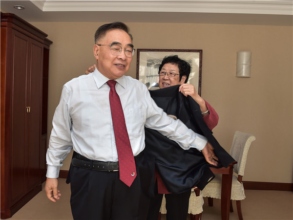 9月8日上午,「人民英雄」国家荣誉称号获得者张伯礼在出发前由妻子协助穿衣。