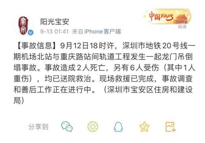 据@阳光宝安通报,12日18时许,深圳市地铁20号线一期机场北站与重庆路站间轨道工程发生一起龙门吊倒塌事故。