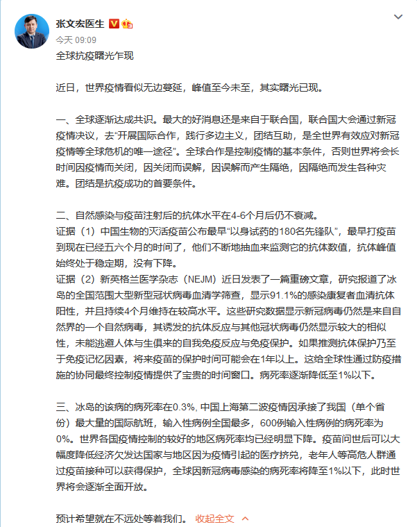 13日,上海市新冠肺炎醫療救治專家組組長、復旦大學附屬華山醫院感染科主任張文宏在微博發表文章指出,自然感染與疫苗注射後的抗體水平可維持在4至6個月內,強調「預計希望就在不遠處等著我們」。