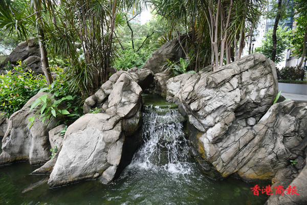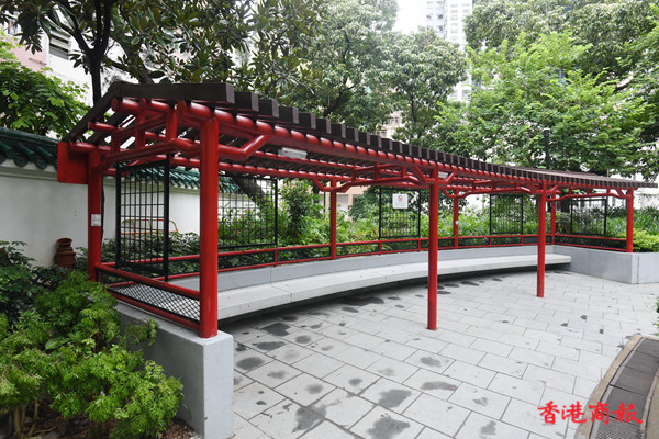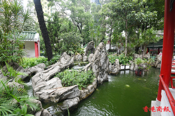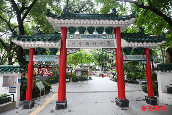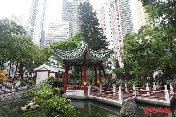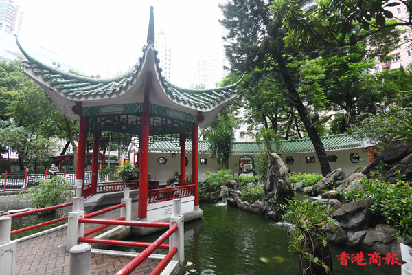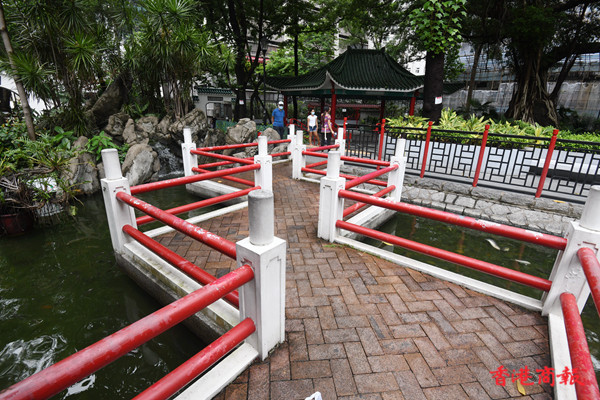 荷李活道公園設有多個涼亭及中式拱門,四周都栽滿花草,綠樹成陰,每個涼亭都有長椅可供市民避陽避暑。公園中心的涼亭被中央水池包圍,旁邊有中式庭園特色的九曲橋, 水池中有不少烏龜和魚在水中畅游。(记者 蔡啟文 攝)