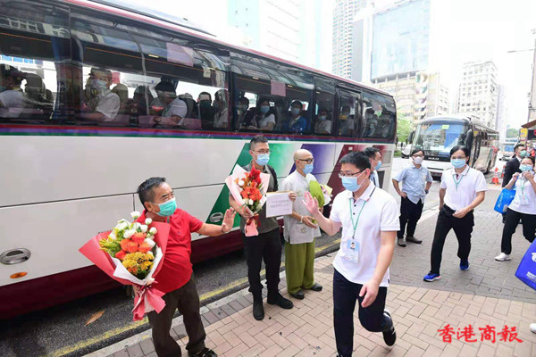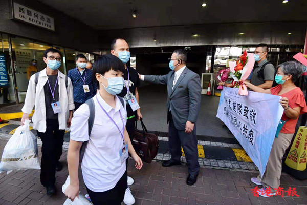 民間團體「政中香港人」4位成員,今午到九龍維景酒店,向內地核酸檢測支援隊致謝並歡送他們離港。支援隊成員見到市民向他們致意,亦親切地揮手作回應。