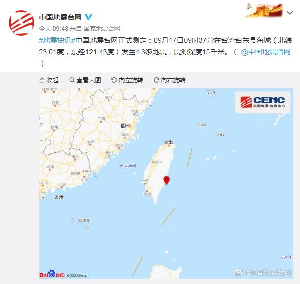 据国家地震台网官方微博消息,中国地震台网正式测定:9月17日9时37分在台湾台东县海域(北纬23.01度,东经121.43度)发生4.3级地震,震源深度15千米。