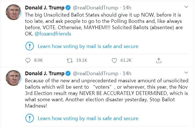 他在社交网站发文指,由于会有前所未有的邮递选票,11月3日的大选结果可能永远都无法准确确定,认为是某些人想要的结果,形容是选举的灾难,呼吁停止这种疯狂的投票做法。特朗普又指容许邮递投票的大州分,现时停止这种做法仍未太迟,并要呼吁选民同以往一样,亲身前往票站。