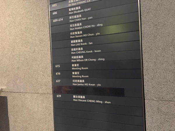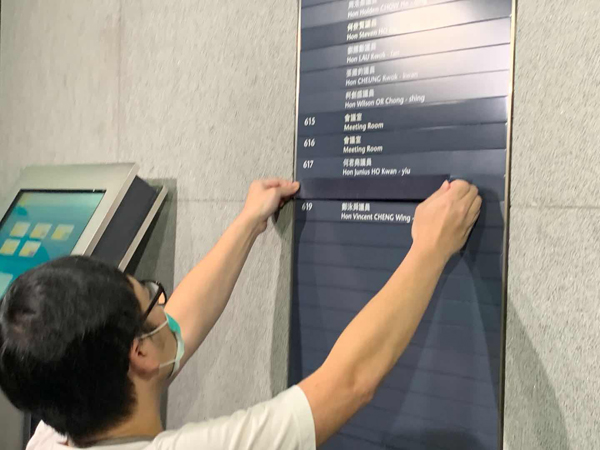 立法會秘書處今日移除陳凱欣議員辦事處水牌。 (何加祺 攝)