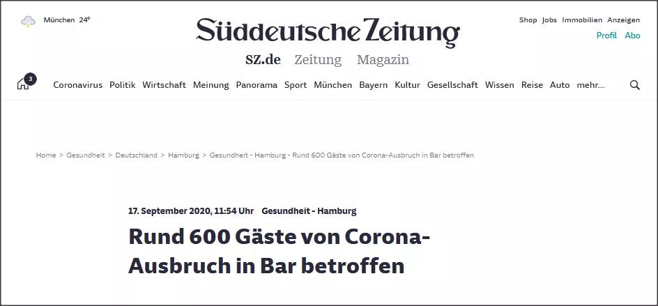 《南德意志报》报道:酒吧爆发新冠感染事件,约600名顾客受牵连