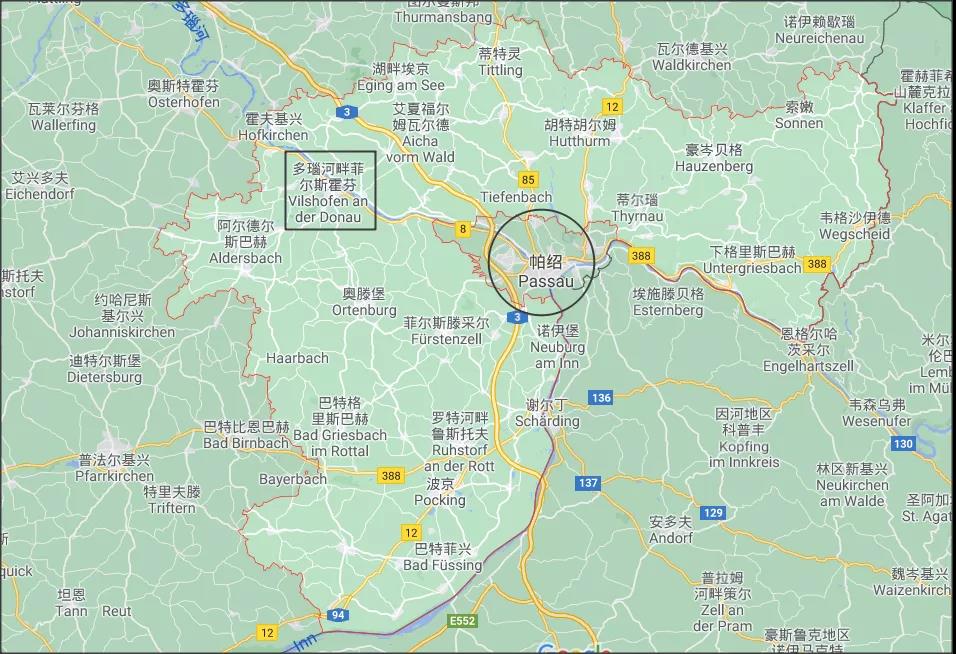 图中红色区域就是帕绍县,方框标注的区域就是Vilshofen小城