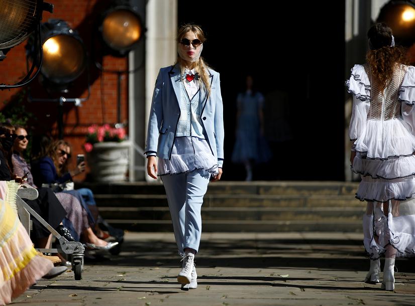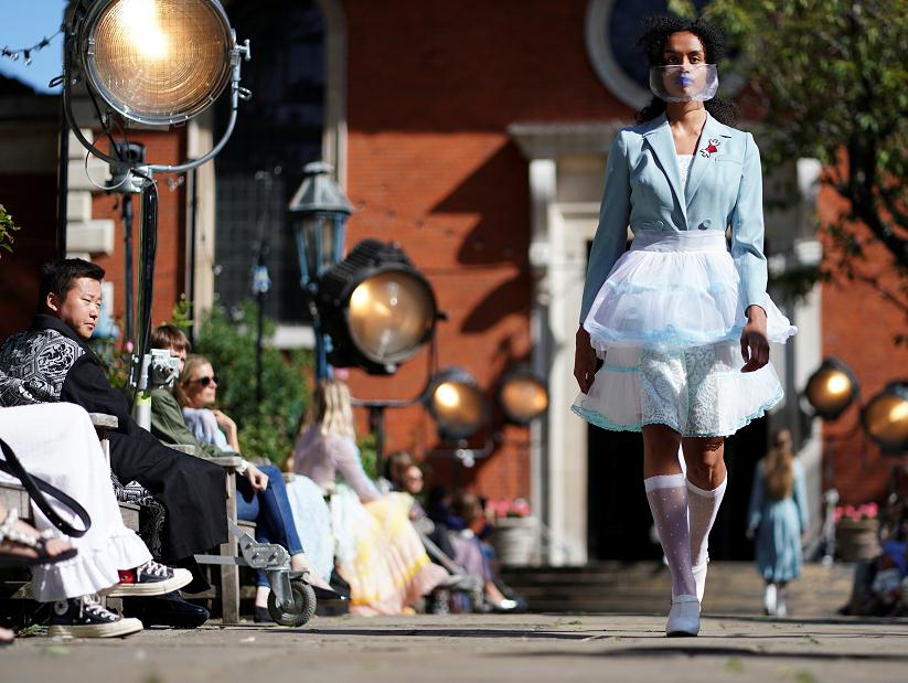 當地時間9月18日,2020年倫敦時裝周啟幕,模特們在時裝週上展示以「防疫 」為主題的時裝作品。 (圖源:路透社)