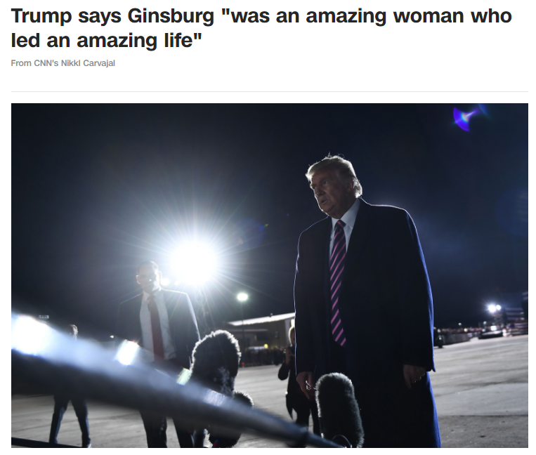 报道说,发表评论后,特朗普登上了「空军一号」专机。CNN说,金斯伯格去世的消息传出之际,特朗普正在明尼苏达州举行集会。