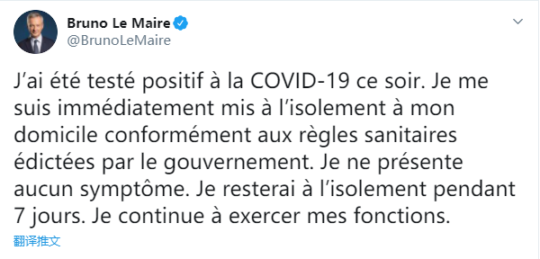 法国经济、财政与振兴部长布鲁诺·勒梅尔9月18日晚通过其推特账户宣布,他的新冠病毒检测结果呈阳性。