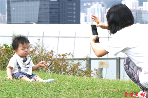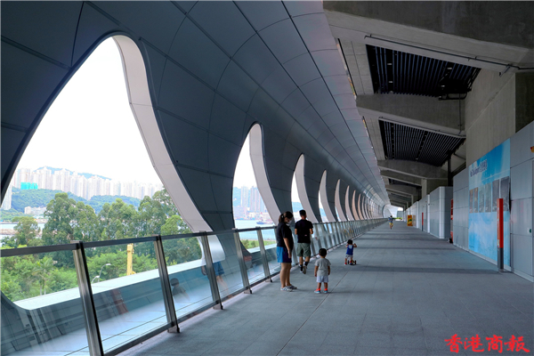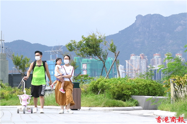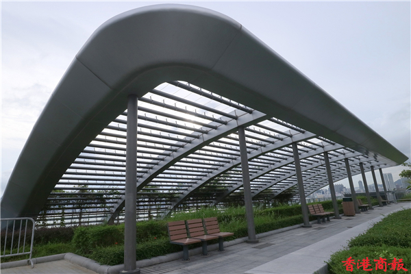 在郵輪碼頭天台的公園以「山、城、水」為設計概念,利用螺旋狀及縱橫交錯的人行通道,創造有趣味的行人體驗。植物花園內的「水園」展示荷花,又有地形奇趣的兒童綠洲和嬉水廣場,而面向維多利亞港一方的觀景平台,讓遊人可飽覽維多利亞港的景致。(記者馮瀚文 攝)
