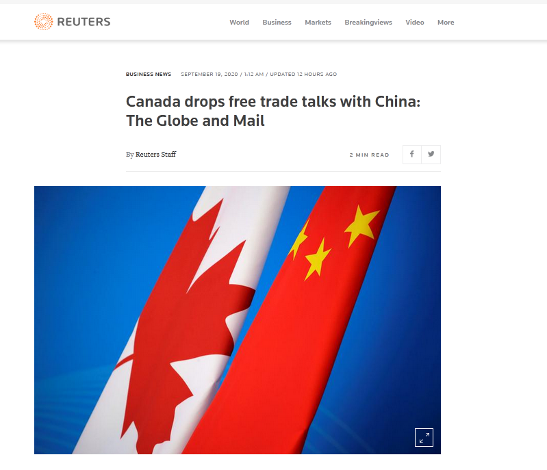 路透社称,商鹏飞的这番表态代表加拿大搁置了与世界第二大经济体达成自由贸易协议的想法。此前,对于中加贸易谈判,加拿大总理特鲁多曾受到了加拿大国内批评人士的压力,他们指责特鲁多自愿做出太多让步,以换取与中国的更多贸易往来。