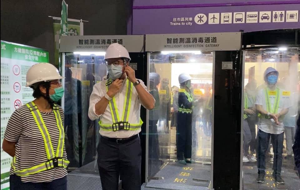 各人在入場前,需要經過智能測溫消毒通道,左一為建築署署長林余家慧、左二為發展局局長黃偉綸。