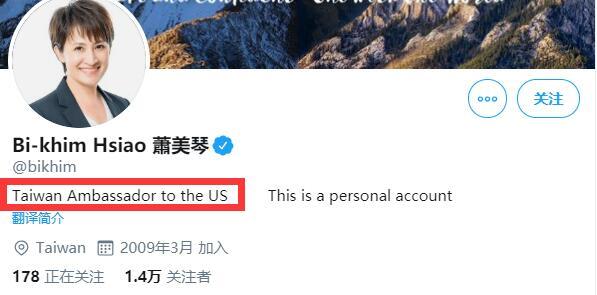 综合台湾「联合新闻网」等多家台媒报道,台湾「驻美代表」萧美琴将推特账号的简介变更为「台湾驻美大使」(Taiwan Ambassador to the US)。台媒称,台湾当局在非「友邦」的驻外机构,通常以「代表处」或「办事处」等命名,萧美琴推特的改名,被绿媒炒作为「台湾『外交』的又一突破。」