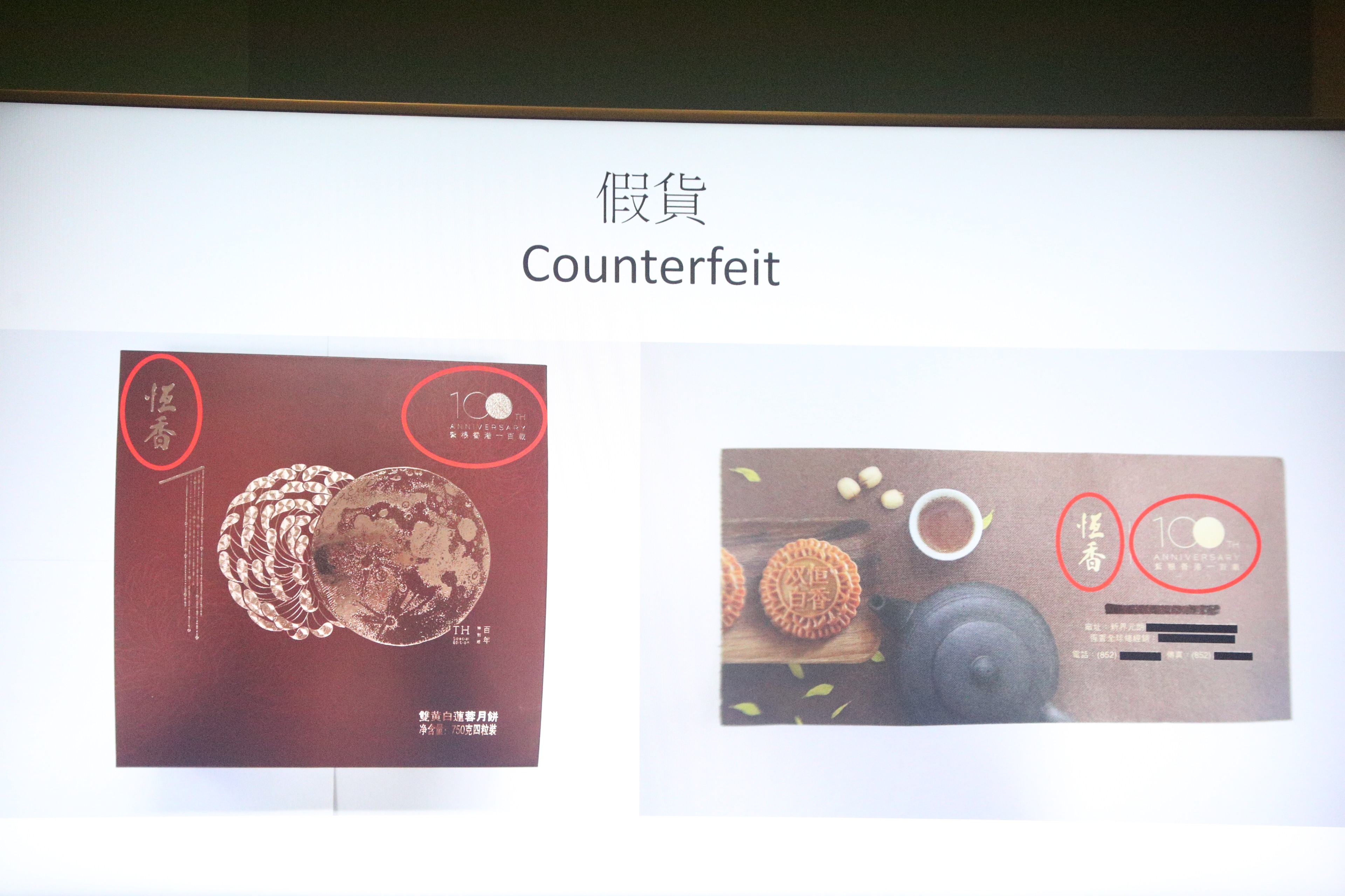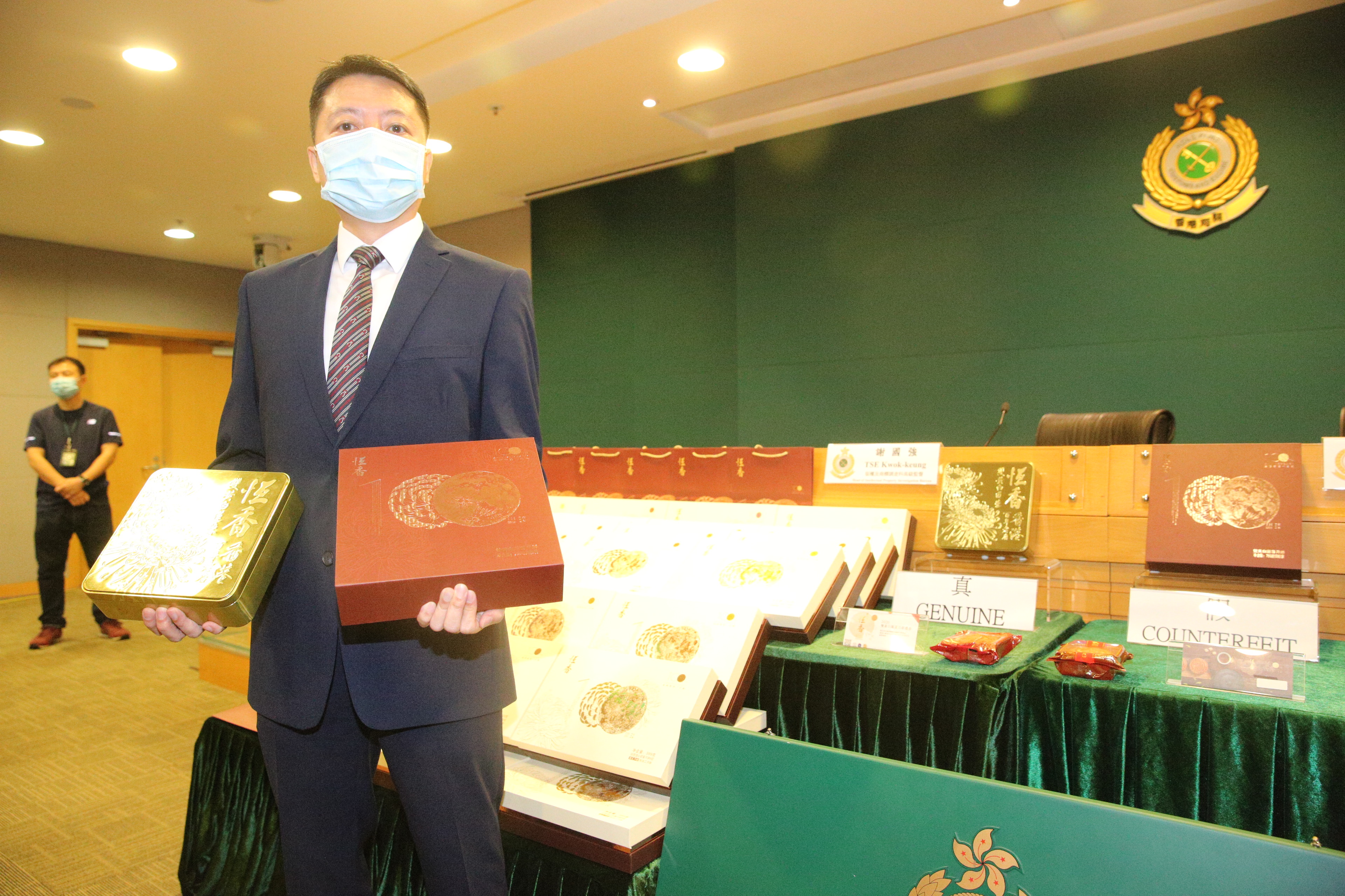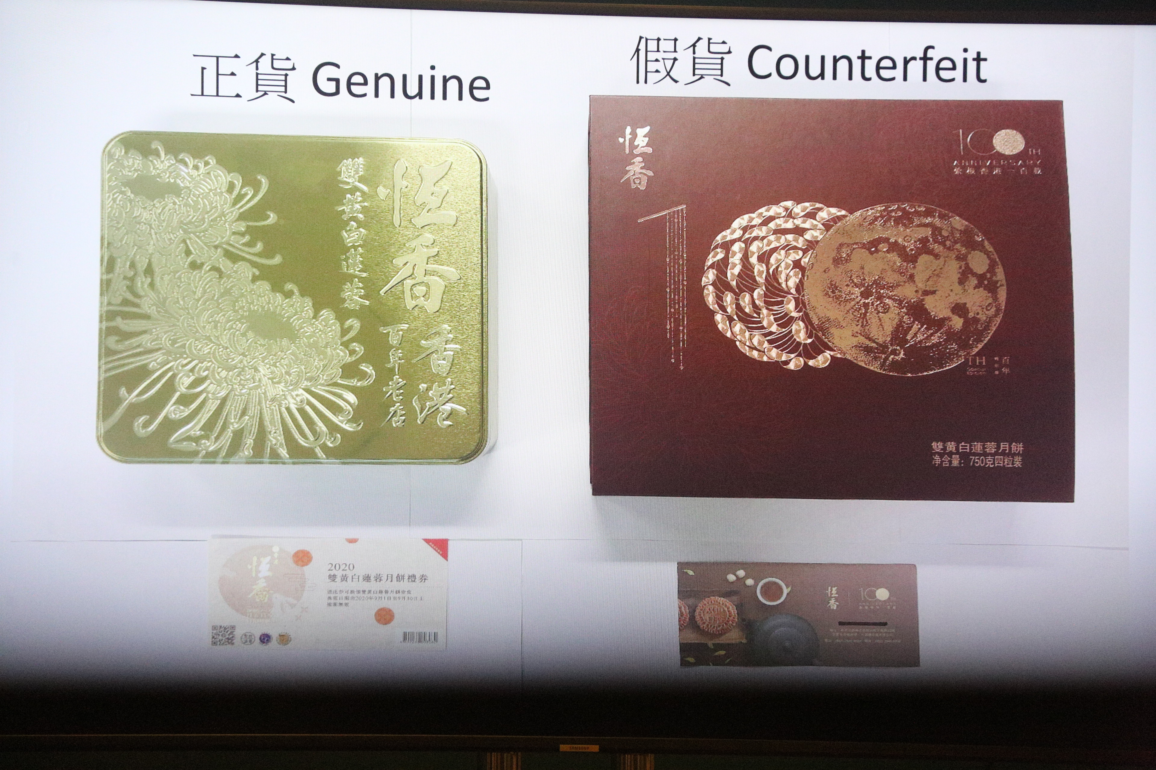謝國強指出,涉及的月餅品牌在香港行銷多年,檢獲的冒牌月餅包裝盒和換領券均抄襲正價貨品的註冊商標,並利用該品牌在本年於香港成立100周年,在月餅盒和月餅券上標誌是百年老字號,另外在月餅盒背標的地址,是該品牌的舊廠房地址,但產品是委託另一生產商代為加工 。而在售價方面,冒牌貨是正價貨品的7折 。初步調查相信月餅主要在內地銷售 ,但因疫情關係內地旅客無法來港購買月餅 ,不排除有人想製造1個香港品牌在內地製造的假象,相信有少部分流入香港市場 ,海關行動已即時阻止該批月餅再講繼續銷售。