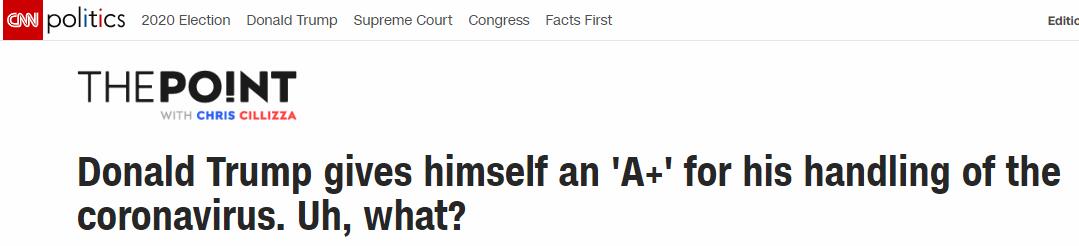 对于特朗普此番言论,美国有線電視新聞網CNN发表题为《Donald Trump gives himself an 'A+' for his handling of the coronavirus. Uh,WHAT?》的文章讽刺:美国很快将迎来一个严峻的里程碑——新冠病毒死亡病例将达到20万,而唐纳德·特朗普总统如何「评价」这一巨大的生命损失?他给出的回答是「一项了不起的工作,A+。」
