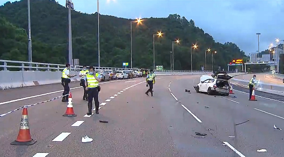 警方到場封閉3條行車線進行調查,肇事私家車嚴重撞毀,車頭泵把飛脫,零件散落一地,現場遺下約100米煞車胎痕及血漬,以及男司機的波鞋。警員同時發現在司機位的安全帶扣位置,插有1個俗稱「靜音扣」的安全帶插片。現場消息稱,男司機與女友人早前在大角咀與朋友消遣,其後由男司機接載女友人回沙田寓所,途中女友人入睡,直至意外發生時才驚醒。
