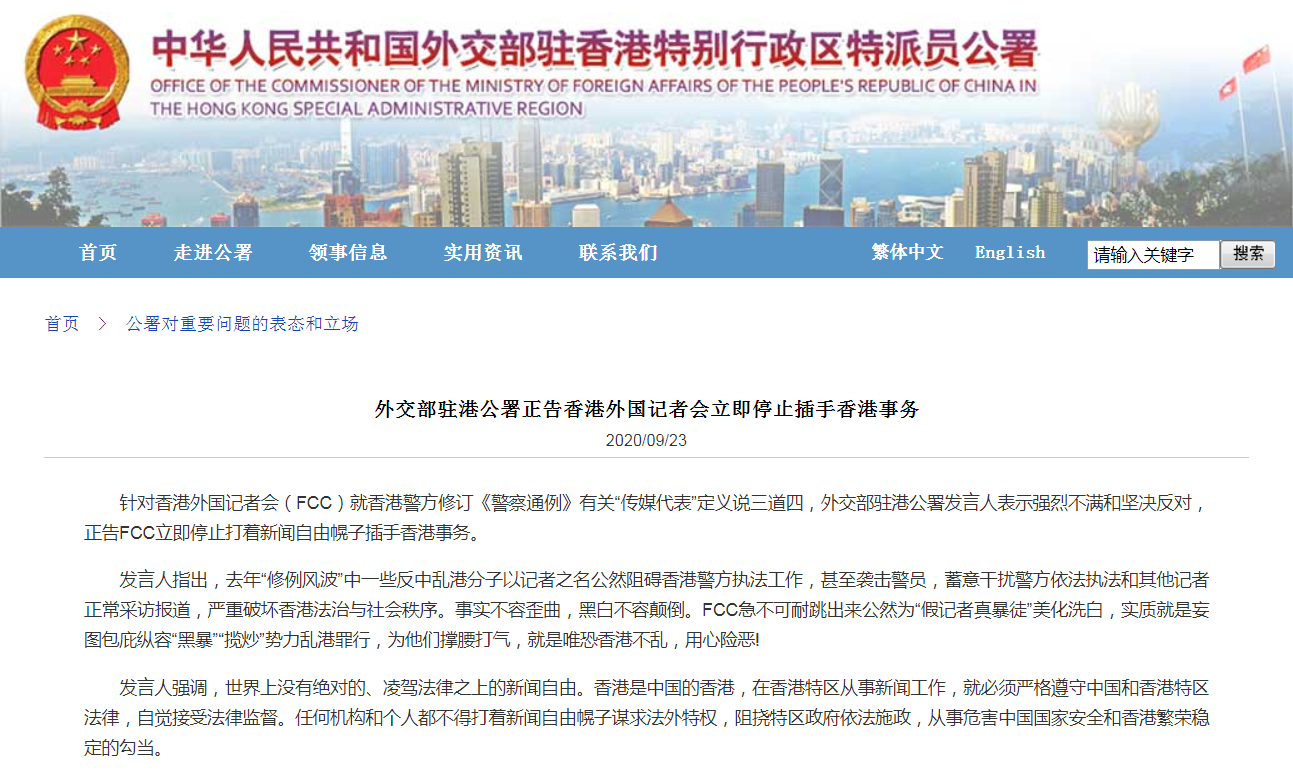 針對香港外國記者會(FCC)就香港警方修訂《警察通例》有關「傳媒代表」定義說三道四,外交部駐港公署發言人表示強烈不滿和堅決反對,正告FCC立即停止打著新聞自由幌子插手香港事務。