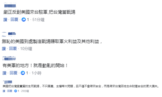 有島內網友还表示,「難道你不知道,世界上所有美軍駐軍的地方……都沒有和平!」「美軍駐軍後要我們多付錢養他們?而且照以前歷史來看,美國介入的地方很容易發生擦槍走火甚至引發戰爭」。