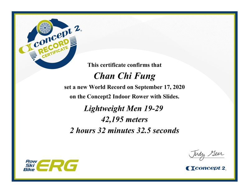 22歲的港隊賽艇新星陳至鋒(Thomas)上周四(17日)於Concept 2室內賽艇(滑軌)輕量級男子19至29歲的42,195米項目,以2小時32分32.5秒的時間,打破原本由加拿大賽艇手Sam Garber保持的成績,以快逾4分鐘的時間,輕鬆刷新世界紀錄。