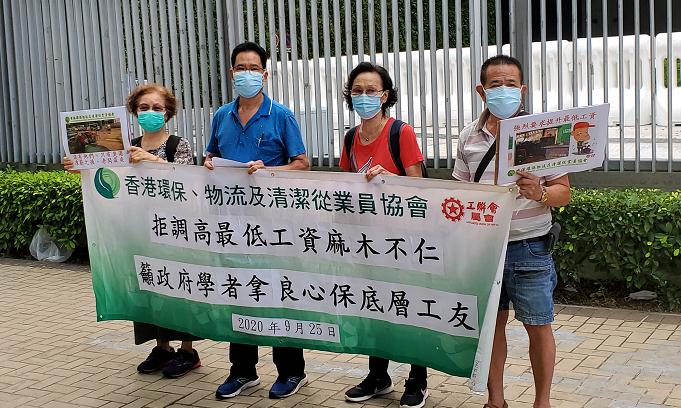 香港環保、物流及清潔從業員協會(工聯會屬會)等多名代表今日(25日)到政府總部向行政長官遞交請願信,表達對最低工資水平可能被凍結的憂慮與憤怒。